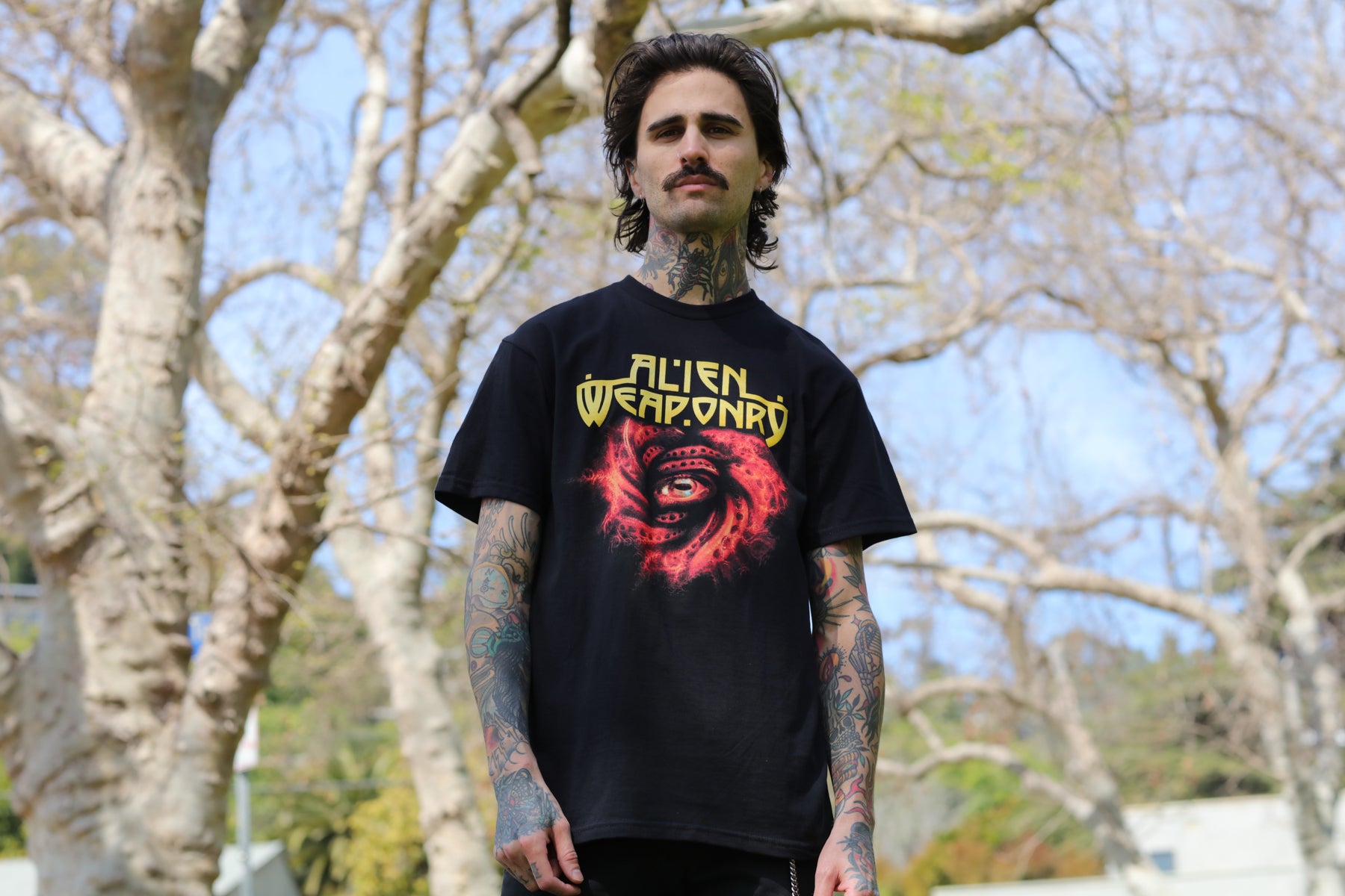 The Alien Weaponry Spiral Eye design, printed on a comfortable, standard-fitting black shirt.